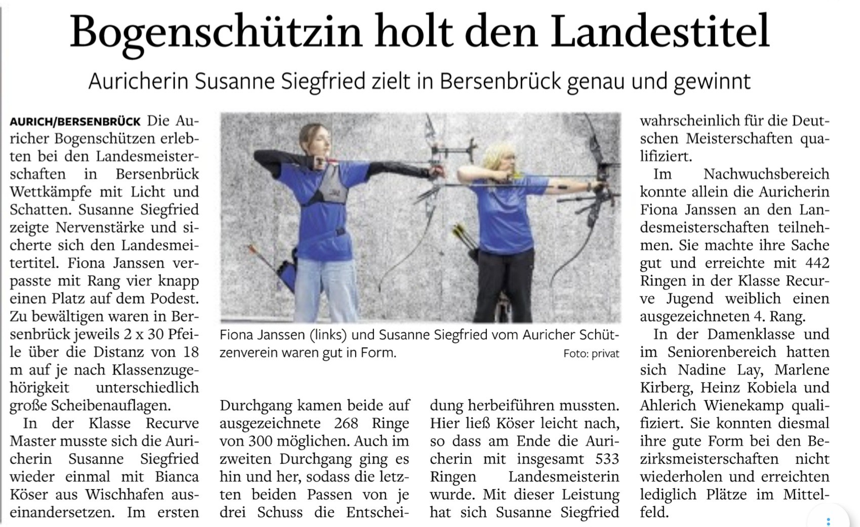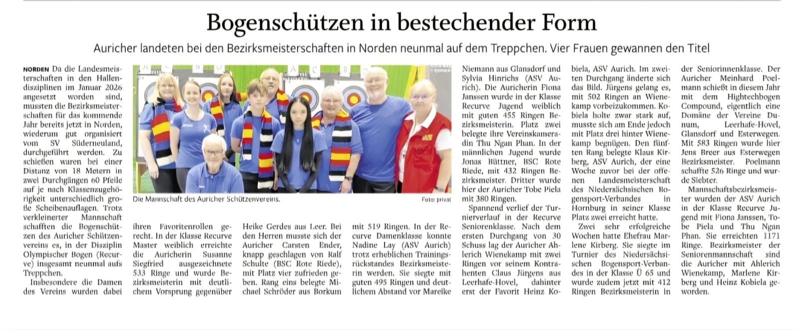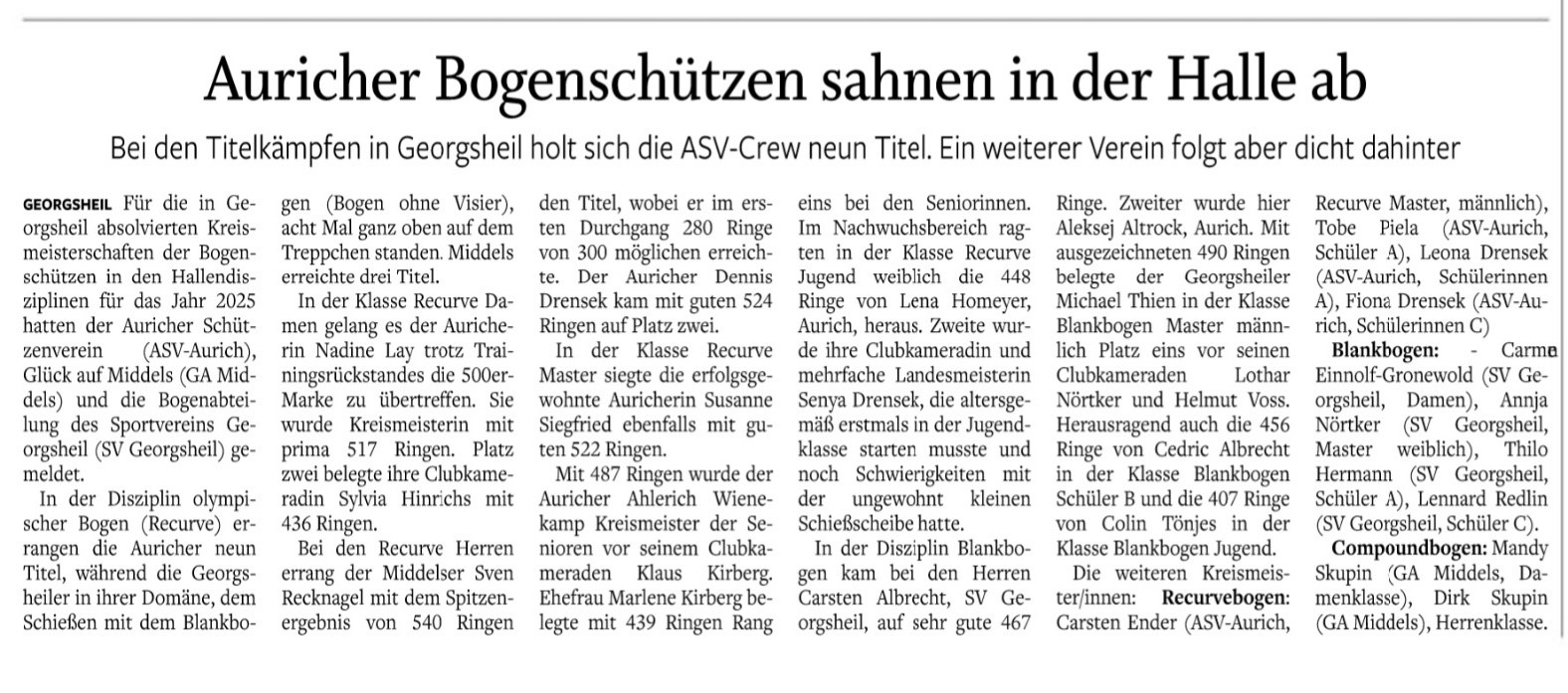 Die Bogenschützen des Auricher Schützenvereins konnten bei den Bezirksmeisterschaften Halle 2025, die wegen der dann späteren Outdoor-Saison bereits Anfang nächsten Jahres beendet sein müssen, mehrere Titel gewinnen.