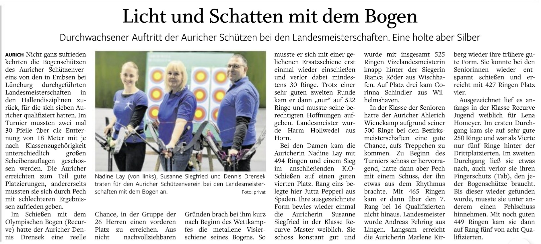 Mit herausragenden 1577 Ringen war dann dem Auricher SV 1616 mit Dennis Drensek, Susanne Siegfried und Nadine Lay der Bezirksmeistertitel in der Mannschaftswertung vor dem SV Leer 1550, der auf 1507 Ringe kam, nicht zu nehmen.